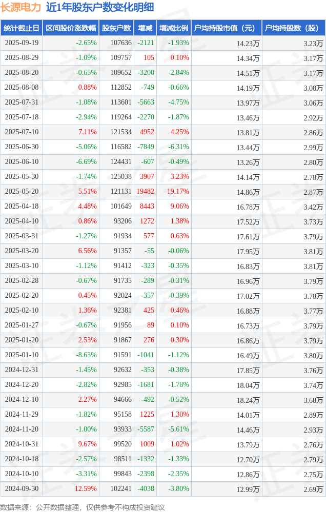 从股价来看,2025年8月29日至2025年9月19日,长源电力区间跌幅为2.65%,在此期间股东户数减少2121.0户,减幅为1.93%。