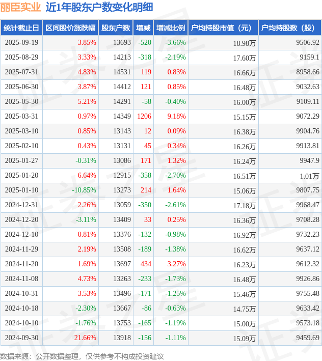 从股价来看,2025年8月29日至2025年9月19日,丽臣实业区间涨幅为3.85%,在此期间股东户数减少520.0户,减幅为3.66%。