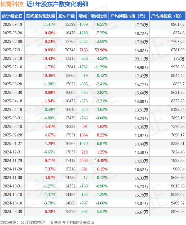 从股价来看,2025年8月20日至2025年9月19日,长青科技区间跌幅为11.41%,在此期间股东户数减少1079.0户,减幅为6.55%。