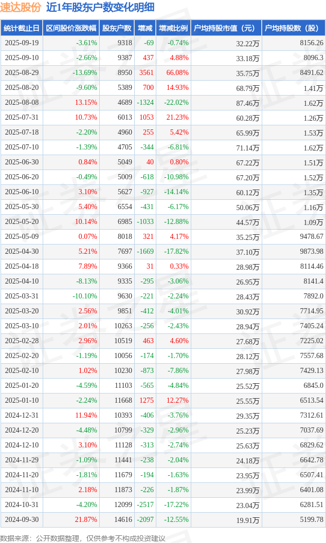 从股价来看,2025年9月10日至2025年9月19日,速达股份区间跌幅为3.61%,在此期间股东户数减少69.0户,减幅为0.74%。