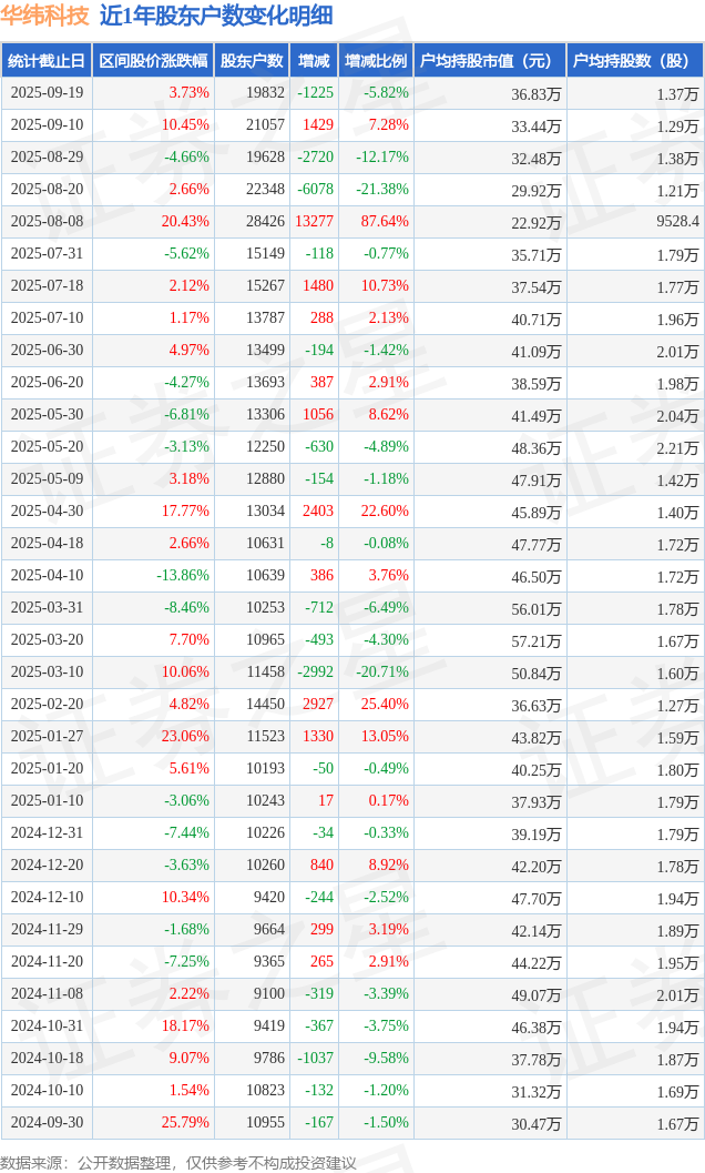 从股价来看,2025年9月10日至2025年9月19日,华纬科技区间涨幅为3.73%,在此期间股东户数减少1225.0户,减幅为5.82%。