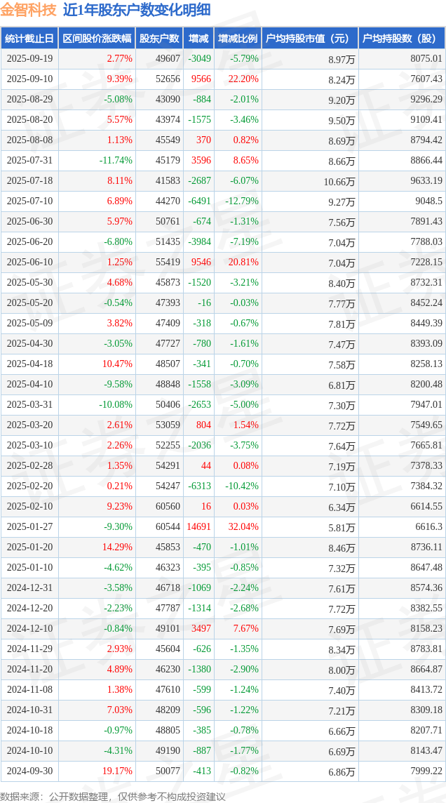 从股价来看,2025年9月10日至2025年9月19日,金智科技区间涨幅为2.77%,在此期间股东户数减少3049.0户,减幅为5.79%。