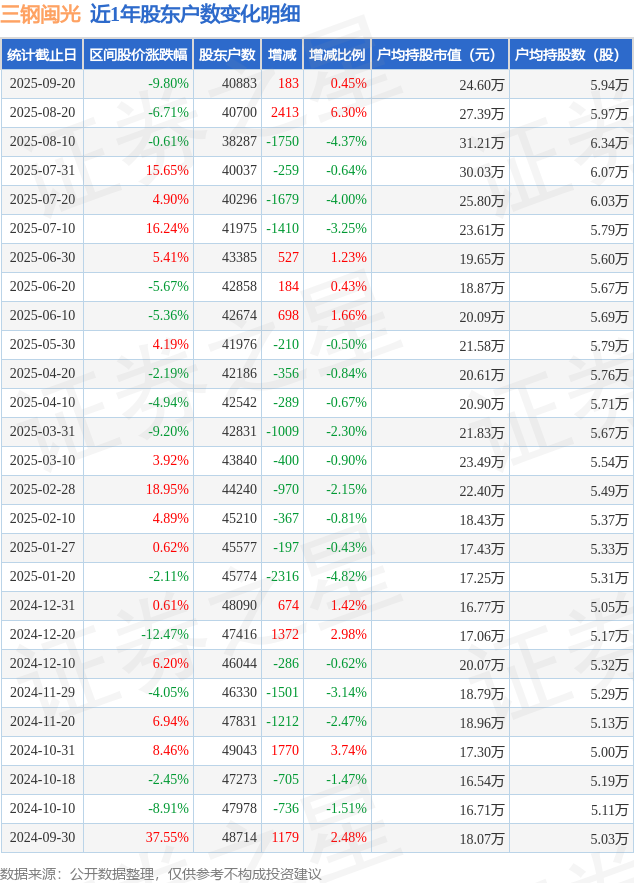 从股价来看,2025年8月20日至2025年9月20日,三钢闽光区间跌幅为9.8%,在此期间股东户数增加183.0户,增幅为0.45%。