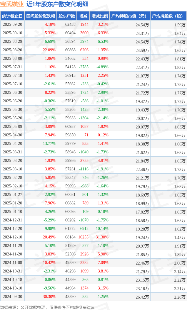 从股价来看,2025年9月10日至2025年9月20日,宝武镁业区间涨幅为4.18%,在此期间股东户数增加1944.0户,增幅为3.21%。