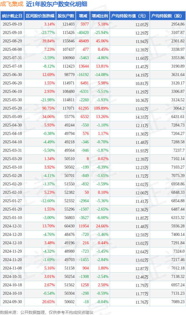 从股价来看,2025年9月10日至2025年9月19日,成飞集成区间涨幅为3.14%,在此期间股东户数增加5977.0户,增幅为5.18%。