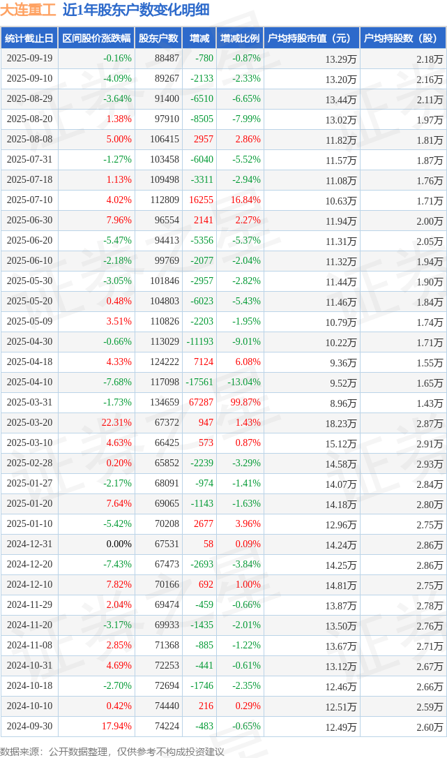 从股价来看,2025年9月10日至2025年9月19日,大连重工区间跌幅为0.16%,在此期间股东户数减少780.0户,减幅为0.87%。