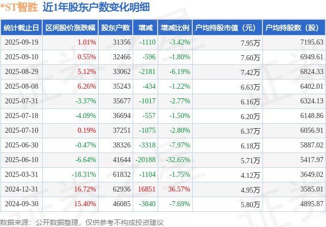 从股价来看,2025年9月10日至2025年9月19日,*ST智胜区间涨幅为1.01%,在此期间股东户数减少1110.0户,减幅为3.42%。