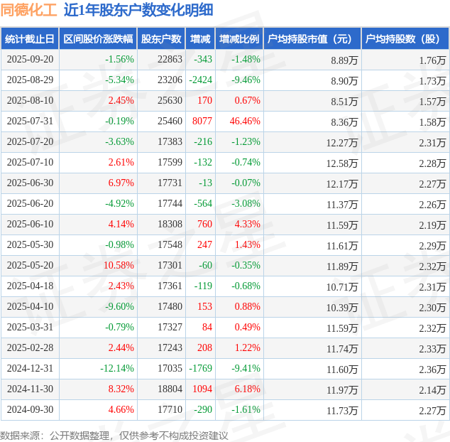 从股价来看,2025年8月29日至2025年9月20日,同德化工区间跌幅为1.56%,在此期间股东户数减少343.0户,减幅为1.48%。