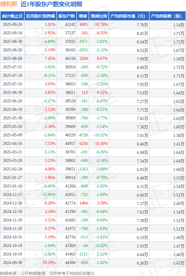 从股价来看,2025年9月10日至2025年9月20日,得利斯区间涨幅为1.01%,在此期间股东户数增加4005.0户,增幅为10.76%。