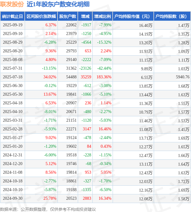 从股价来看,2025年9月10日至2025年9月19日,联发股份区间涨幅为6.37%,在此期间股东户数减少1917.0户,减幅为7.99%。