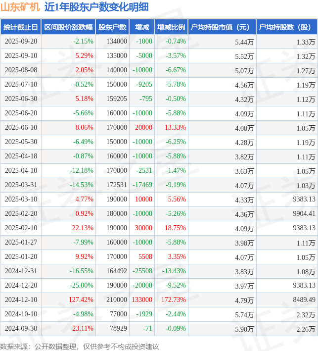 从股价来看,2025年9月10日至2025年9月20日,山东矿机区间跌幅为2.15%,在此期间股东户数减少1000.0户,减幅为0.74%。