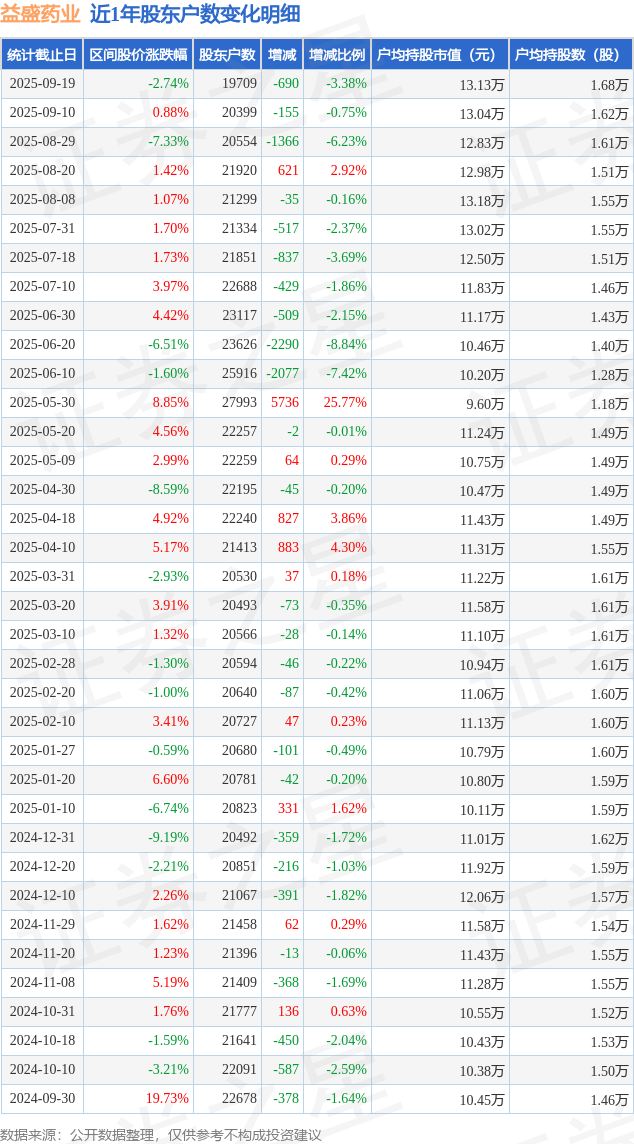 从股价来看,2025年9月10日至2025年9月19日,益盛药业区间跌幅为2.74%,在此期间股东户数减少690.0户,减幅为3.38%。
