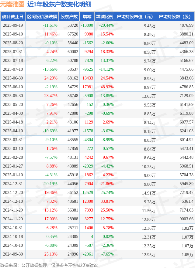 从股价来看,2025年9月10日至2025年9月19日,元隆雅图区间跌幅为11.61%,在此期间股东户数减少1.38万户,减幅为20.44%。
