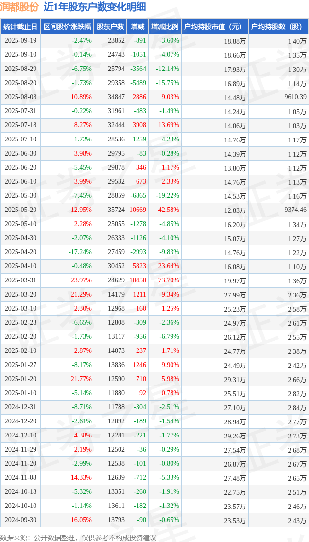 从股价来看,2025年9月10日至2025年9月19日,润都股份区间跌幅为2.47%,在此期间股东户数减少891.0户,减幅为3.6%。