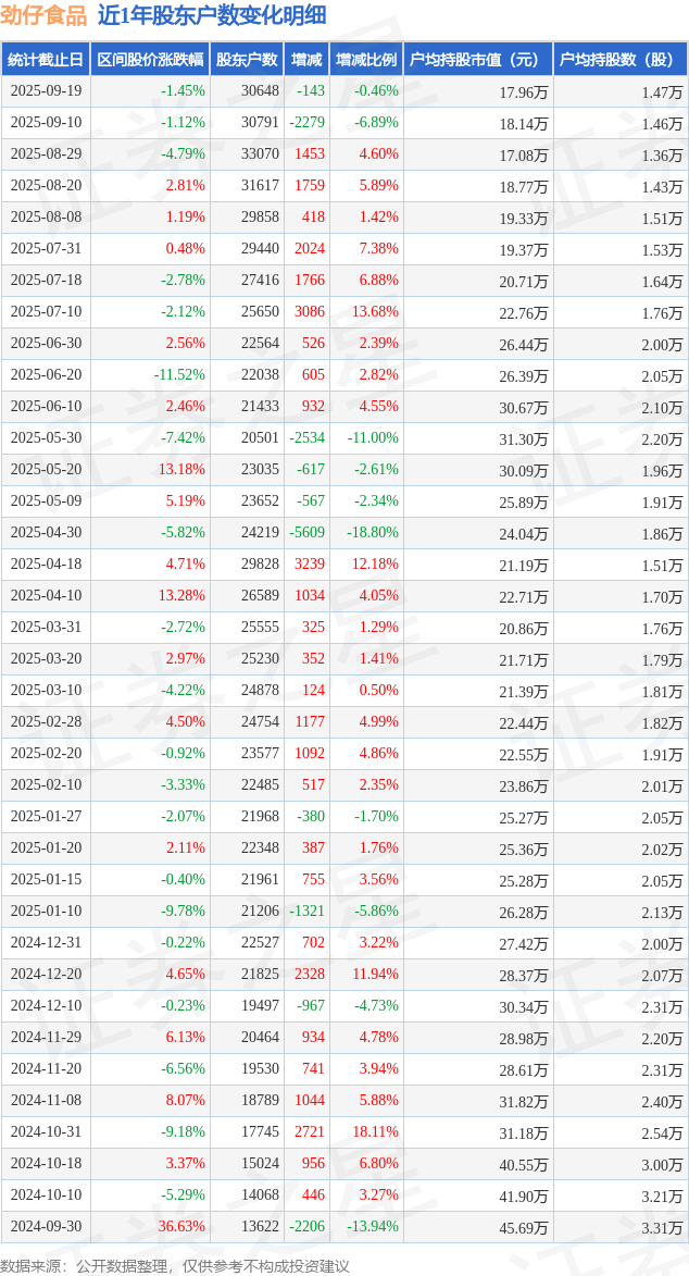 从股价来看,2025年9月10日至2025年9月19日,劲仔食品区间跌幅为1.45%,在此期间股东户数减少143.0户,减幅为0.46%。
