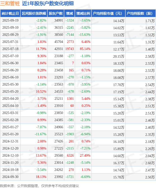 从股价来看,2025年9月10日至2025年9月19日,三和管桩区间跌幅为2.82%,在此期间股东户数减少1324.0户,减幅为3.65%。