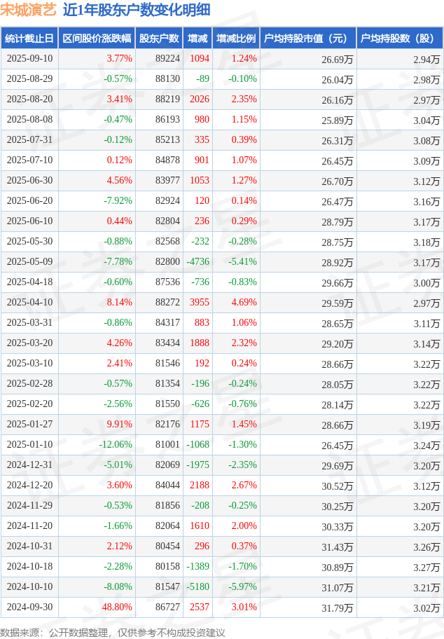 从股价来看,2025年8月29日至2025年9月10日,宋城演艺区间涨幅为3.77%,在此期间股东户数增加1094.0户,增幅为1.24%。