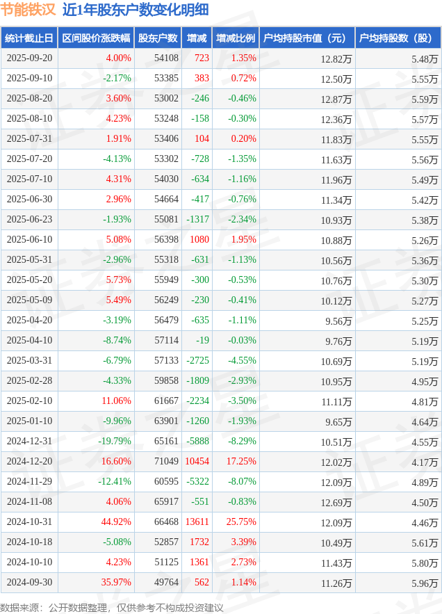 从股价来看,2025年9月10日至2025年9月20日,节能铁汉区间涨幅为4.0%,在此期间股东户数增加723.0户,增幅为1.35%。