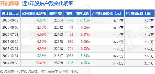 从股价来看,2025年8月8日至2025年9月19日,开能健康区间跌幅为8.0%,在此期间股东户数减少778.0户,减幅为3.41%。