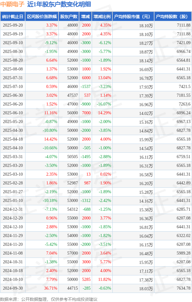 从股价来看,2025年9月10日至2025年9月20日,中颖电子区间涨幅为3.37%,在此期间股东户数增加2000.0户,增幅为4.35%。