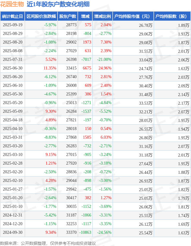 从股价来看,2025年8月29日至2025年9月19日,花园生物区间跌幅为5.97%,在此期间股东户数增加575.0户,增幅为2.04%。