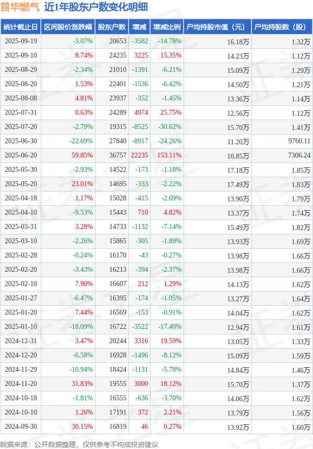 从股价来看,2025年9月10日至2025年9月19日,首华燃气区间跌幅为3.07%,在此期间股东户数减少3582.0户,减幅为14.78%。