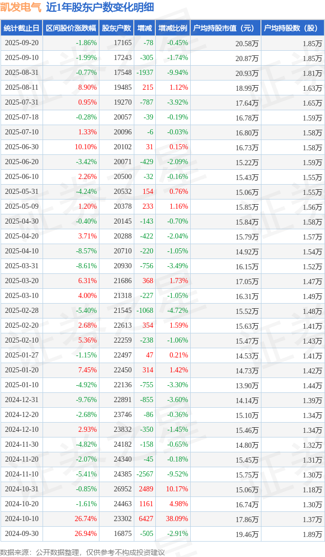 从股价来看,2025年9月10日至2025年9月20日,凯发电气区间跌幅为1.86%,在此期间股东户数减少78.0户,减幅为0.45%。