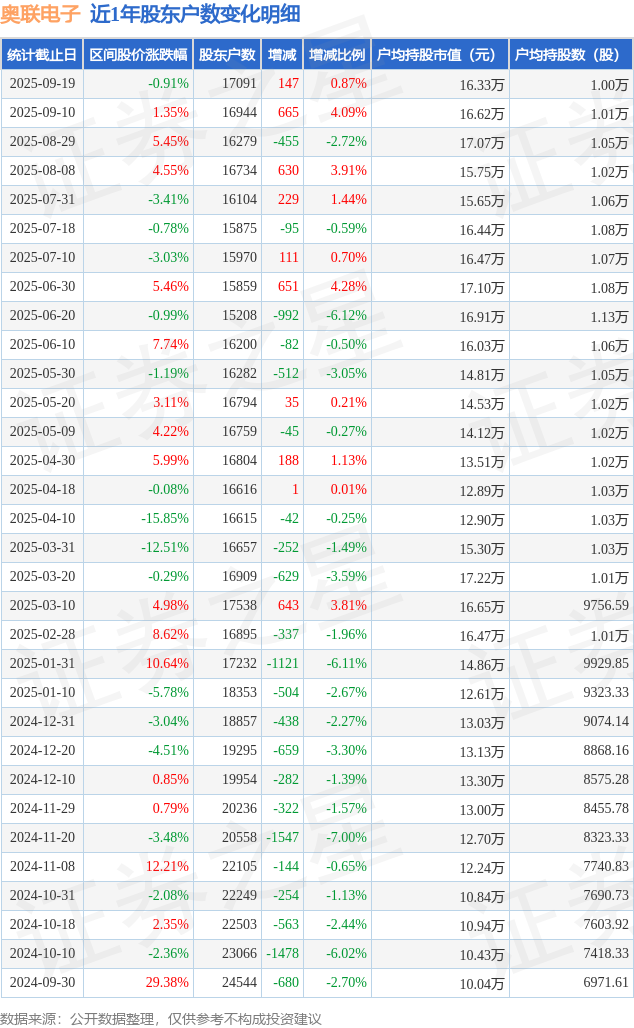 从股价来看,2025年9月10日至2025年9月19日,奥联电子区间跌幅为0.91%,在此期间股东户数增加147.0户,增幅为0.87%。