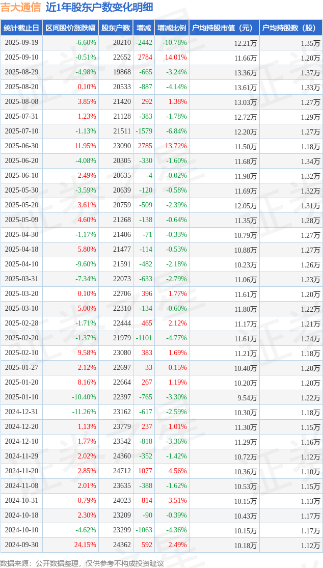从股价来看,2025年9月10日至2025年9月19日,吉大通信区间跌幅为6.6%,在此期间股东户数减少2442.0户,减幅为10.78%。