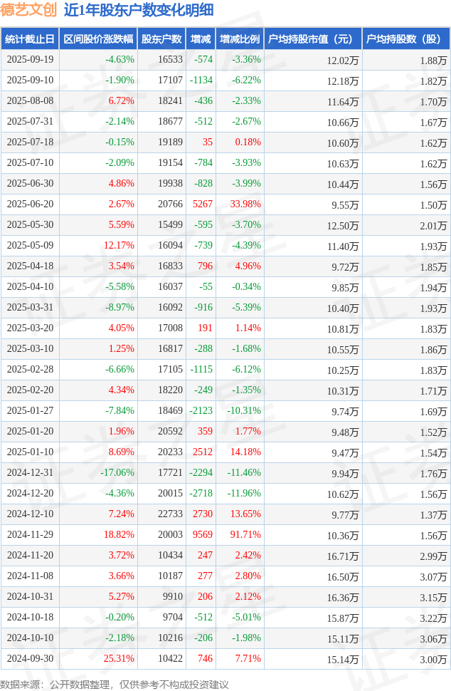 证券之星消息,近日德艺文创披露,截至2025年9月19日公司股东户数为1.65万户,较9月10日减少574.0户,减幅为3.36%。户均持股数量由上期的1.82万股增加至1.88万股,户均持股市值为12.02万元。