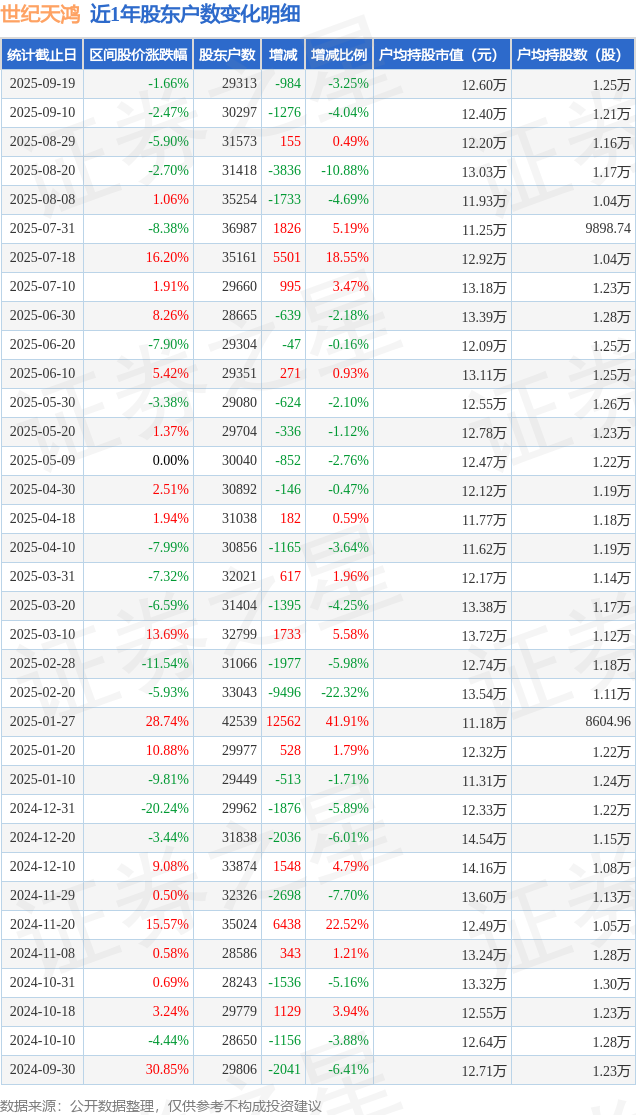 从股价来看,2025年9月10日至2025年9月19日,世纪天鸿区间跌幅为1.66%,在此期间股东户数减少984.0户,减幅为3.25%。