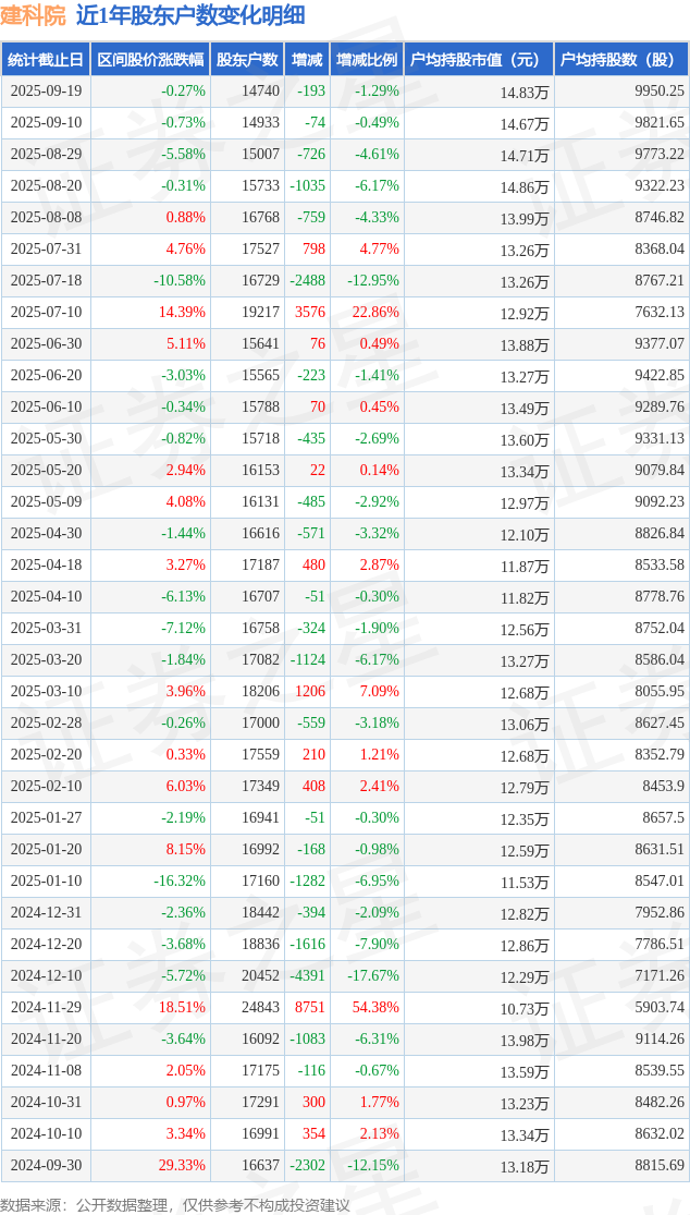 从股价来看,2025年9月10日至2025年9月19日,建科院区间跌幅为0.27%,在此期间股东户数减少193.0户,减幅为1.29%。