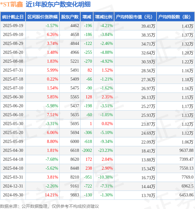 从股价来看,2025年9月10日至2025年9月19日,*ST凯鑫区间跌幅为1.57%,在此期间股东户数减少196.0户,减幅为4.21%。