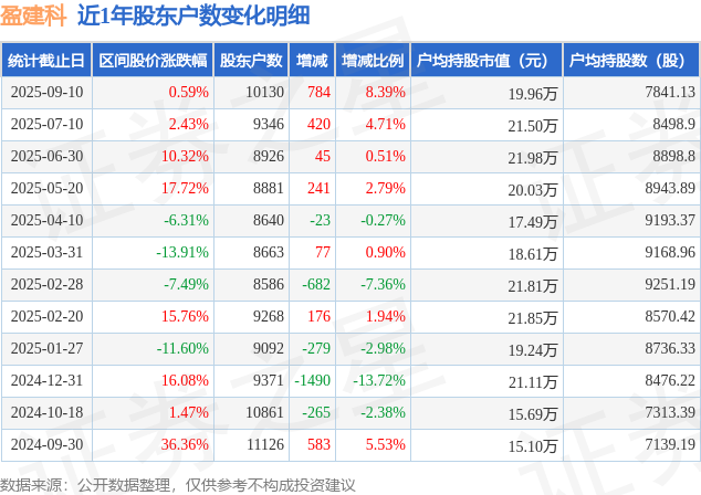 从股价来看,2025年7月10日至2025年9月10日,盈建科区间涨幅为0.59%,在此期间股东户数增加784.0户,增幅为8.39%。