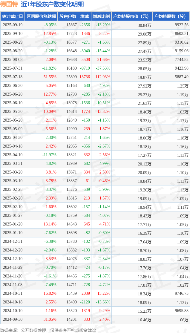 从股价来看,2025年9月10日至2025年9月19日,德固特区间跌幅为8.05%,在此期间股东户数减少2356.0户,减幅为13.29%。
