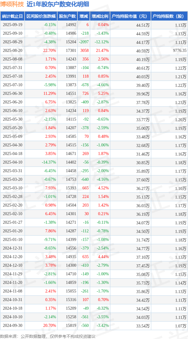 从股价来看,2025年9月10日至2025年9月19日,博硕科技区间跌幅为0.15%,在此期间股东户数增加6.0户,增幅为0.04%。