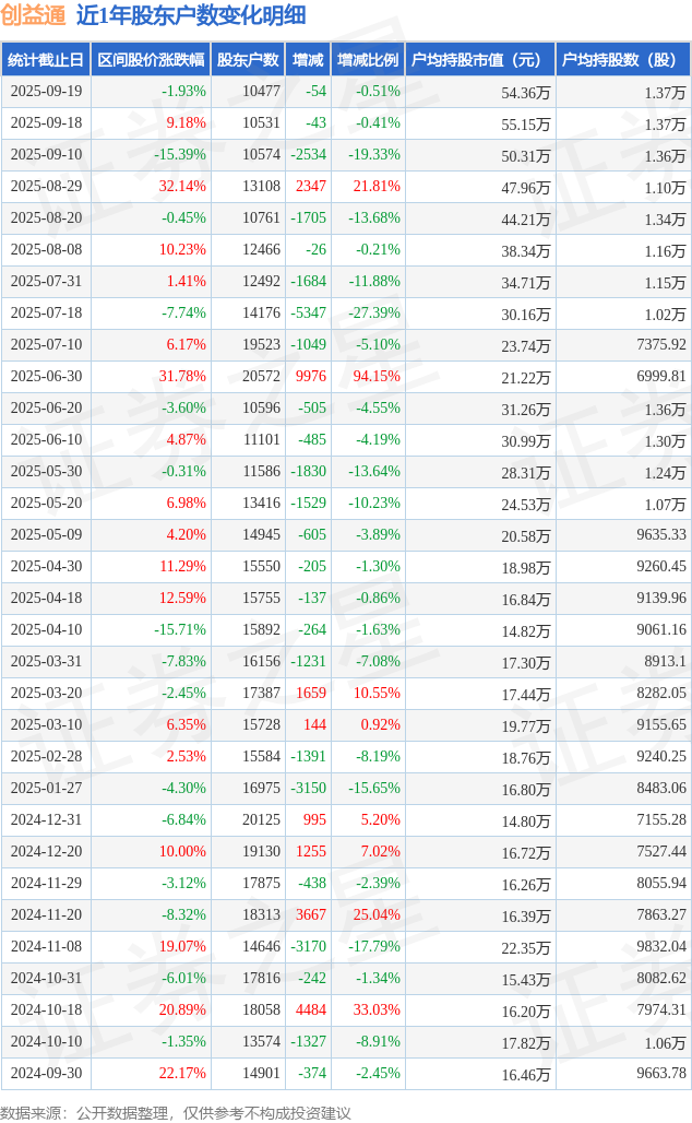 从股价来看,2025年9月18日至2025年9月19日,创益通区间跌幅为1.93%,在此期间股东户数减少54.0户,减幅为0.51%。
