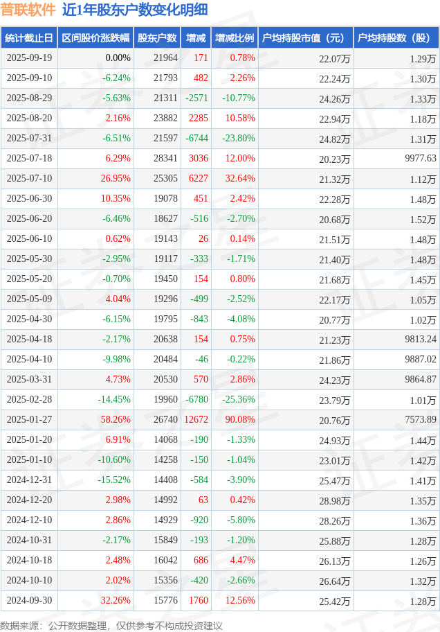 从股价来看,2025年9月10日至2025年9月19日,普联软件区间跌幅为0.0%,在此期间股东户数增加171.0户,增幅为0.78%。