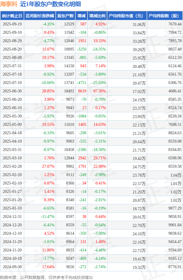 从股价来看,2025年9月10日至2025年9月19日,海泰科区间跌幅为4.35%,在此期间股东户数增加587.0户,增幅为4.92%。