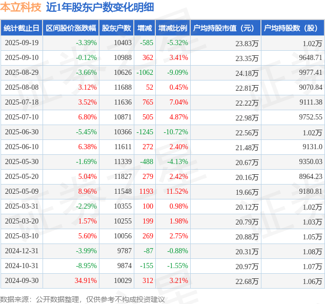 从股价来看,2025年9月10日至2025年9月19日,本立科技区间跌幅为3.39%,在此期间股东户数减少585.0户,减幅为5.32%。