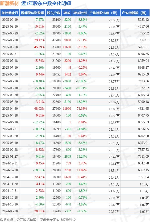从股价来看,2025年9月10日至2025年9月19日,新瀚新材区间跌幅为7.27%,在此期间股东户数减少3200.0户,减幅为8.82%。