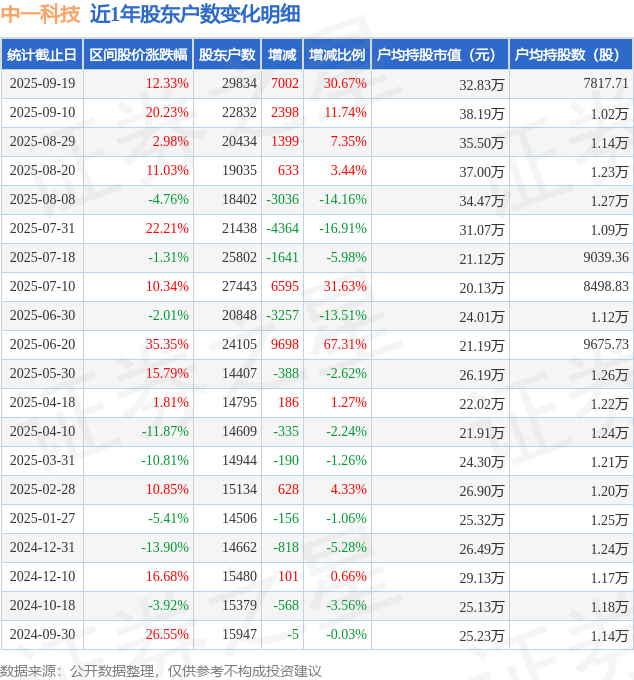 从股价来看,2025年9月10日至2025年9月19日,中一科技区间涨幅为12.33%,在此期间股东户数增加7002.0户,增幅为30.67%。