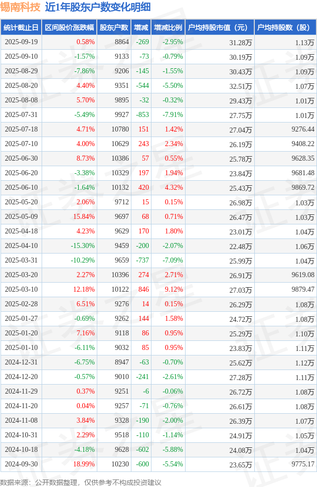 从股价来看,2025年9月10日至2025年9月19日,锡南科技区间涨幅为0.58%,在此期间股东户数减少269.0户,减幅为2.95%。