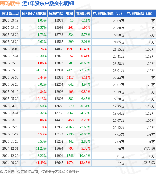 从股价来看,2025年9月10日至2025年9月19日,鸥玛软件区间跌幅为1.05%,在此期间股东户数减少15.0户,减幅为0.11%。
