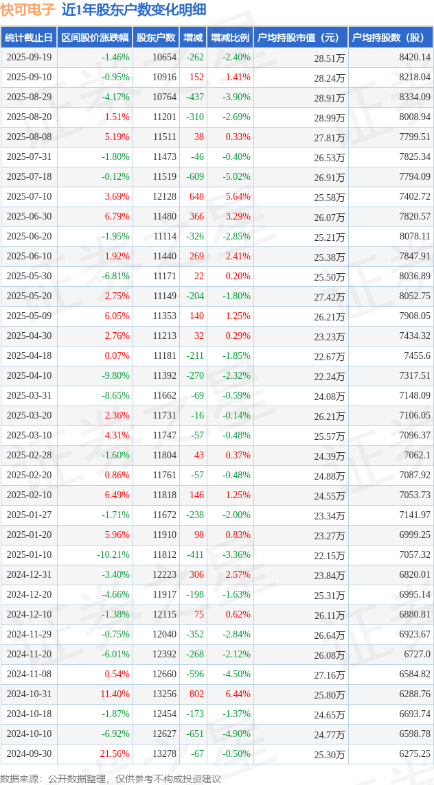 从股价来看,2025年9月10日至2025年9月19日,快可电子区间跌幅为1.46%,在此期间股东户数减少262.0户,减幅为2.4%。