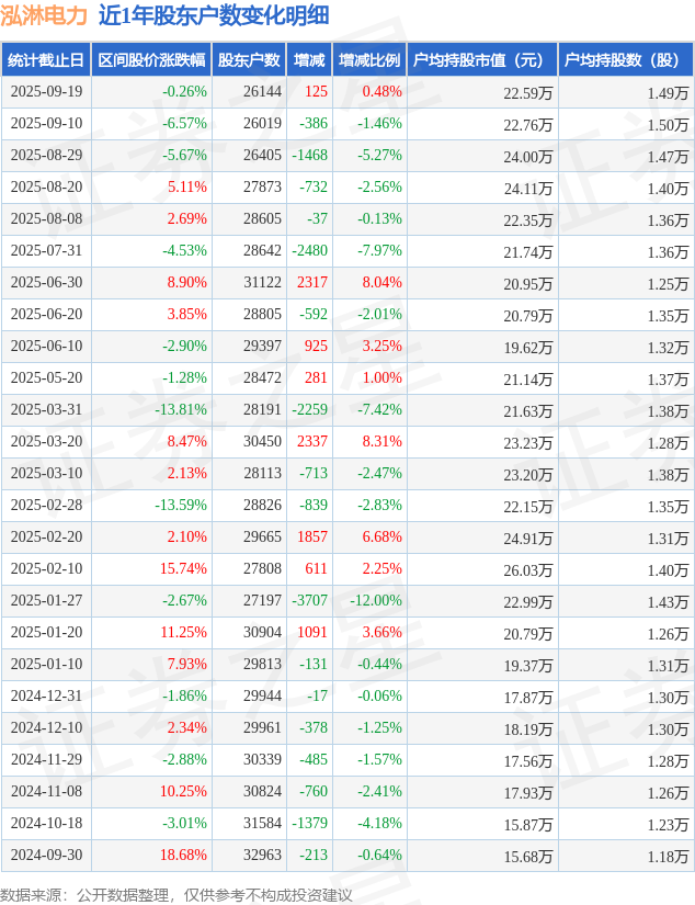 从股价来看,2025年9月10日至2025年9月19日,泓淋电力区间跌幅为0.26%,在此期间股东户数增加125.0户,增幅为0.48%。