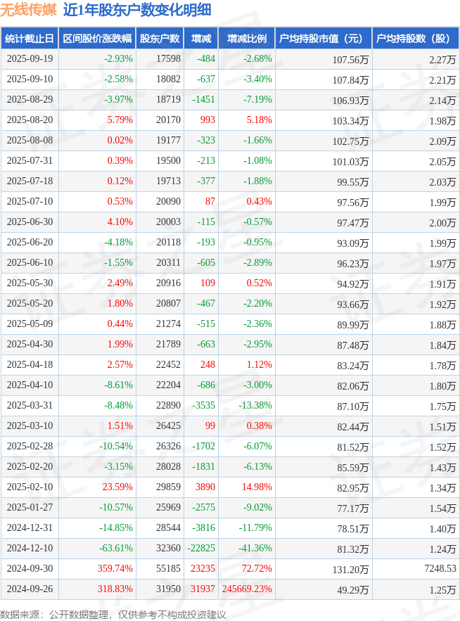 从股价来看,2025年9月10日至2025年9月19日,无线传媒区间跌幅为2.93%,在此期间股东户数减少484.0户,减幅为2.68%。