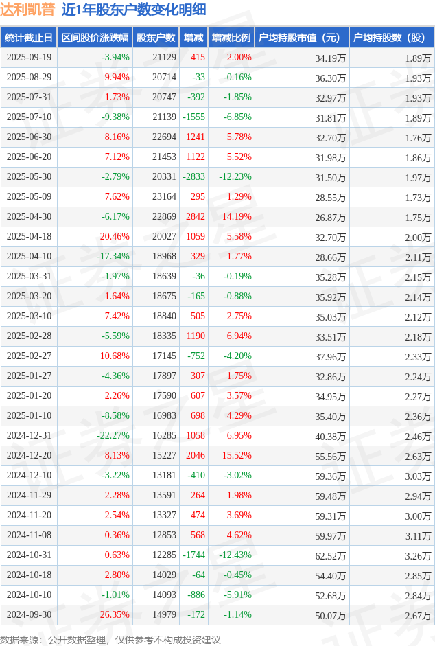 从股价来看,2025年8月29日至2025年9月19日,达利凯普区间跌幅为3.94%,在此期间股东户数增加415.0户,增幅为2.0%。