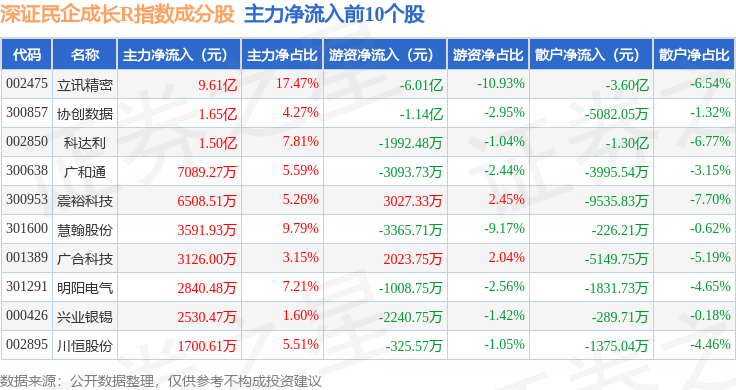 资金流向方面,深证民企成长R(470071)指数成份股当日主力资金净流出合计48.91亿元,游资资金净流入合计13.48亿元,散户资金净流入合计35.43亿元。成份股资金流向详情见下表: