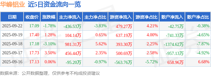 证券之星消息,截至2025年9月22日收盘,华峰铝业(601702)报收于17.09元,下跌1.78%,换手率0.67%,成交量6.66万手,成交额1.14亿元。